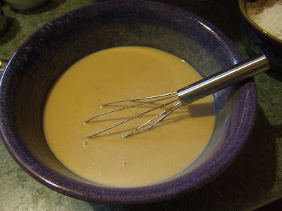 . . . and whisk into the wet. I don't have to worry about the ominous admonition to "DON"T OVERMIX. BATTER WILL BE LUMPY." I don't think so. I am using pastry flour, which has less gluten, so I can whisk the lumps away. That makes me happy. Lumps disturb me. Now I have a big, beautiful bowl o' batter.